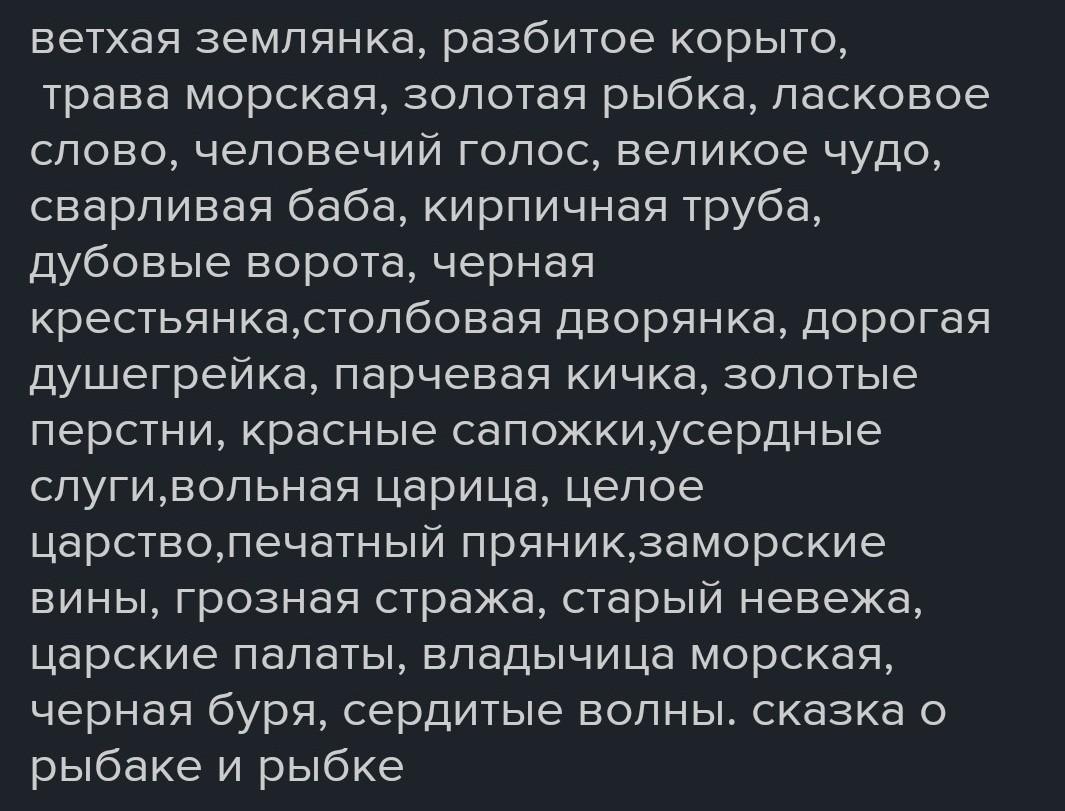 Ветхая землянка, морская трава, золотая рыбка, человечий голос, дорогой откуп, ласковое слово, великое чудо, разбитое корыто, сварливая баба, беленая труба, тесовые вороты, черная крестьянка, столбовая дворянка, высокий терем, соболья душегрейка, парчовая кичка, золотые перстни, красные сапожки, усердные слуги, вольная царица, целое царство, царские палаты, заморские вины, печатный пряник, грозная стража, старый невежа, морская владычица, черная буря, сердитые волны.