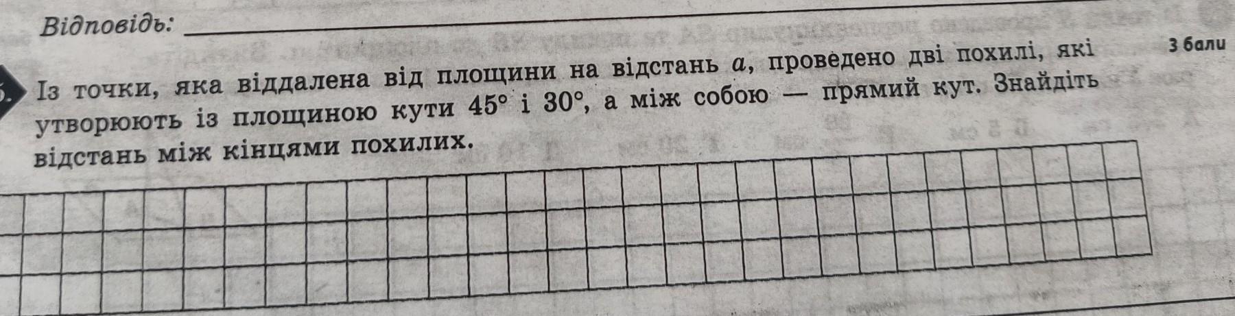 із точки яка віддалена від площин на відстані a проведено дві похилі які утворюють із площиною кути 45град і 30 градусів