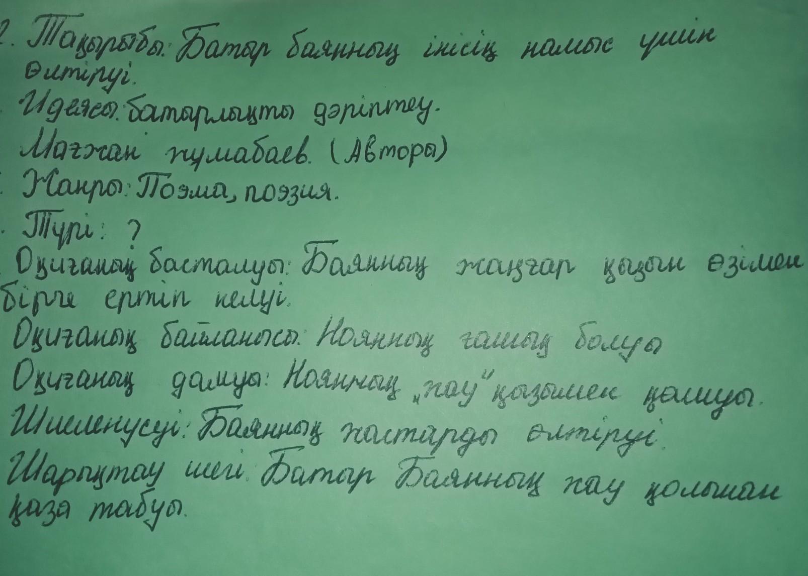1- слайд тапсырмасын орындап маған жібересіңдер 1. Поэма дегеніміз не? Поэма дегеніміз - белгілі бір оқиғаны елеңмен баяндайтын соленага 2.Тапсырма. Поэманы талдау. І «Батыр Баян» поэмасына композициялық талдау. 1.Тақырыбы: 2. Идеясы, 3. Авторы: 4. Жанры: 5. Түрі: 6. Оқиғаның басталуы: 7. Оқиғаның байланысы: 8. Оқиғаның дамуы: 9. Шиеленісуі: 10. Шарықтау шегі: 11.IITemimi: Кейіпкерлер жүйесіне талдау Абыл ай - Батыр Баян — Қалмақ қызы — Ноян -