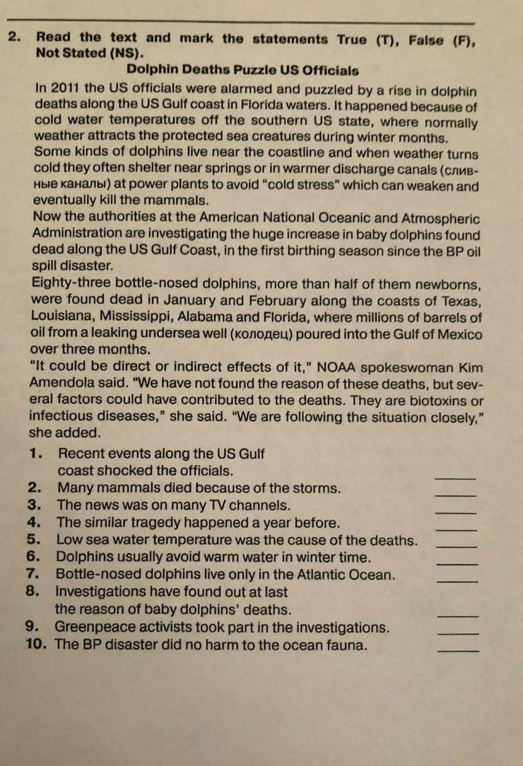 Read the text and mark the statements True (T), False (F), Not Stated (NS). Dolphin Deaths Puzzle US Officials