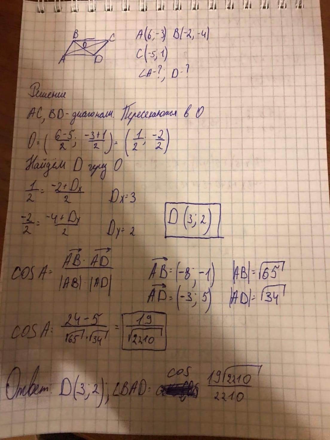 Дан параллелограмм ABCD, три вершины которого заданы A(6;-3), B(-2; -4), C(-5; 1). Найти четвертую вершину и острый угол параллелограмма используя ВЕКТОРЫ.