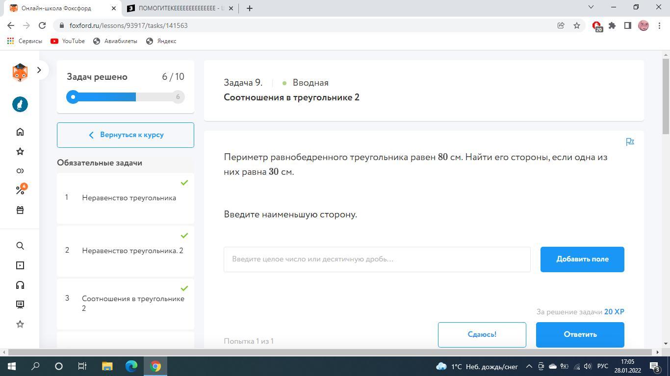 Тут есть два ответа так как там не сказано какая сторона конкретно, если бедро равно 30см то второе бедро тоже а нижняя часть будет равна 80-(30+30)=20см
