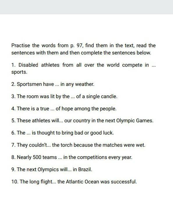 вот слова со строницы: champ; competition; freestyle; membership; fabulous; junior; a flame; a mascot; a spirit; a wheelchair; to compete; to light; to represent.