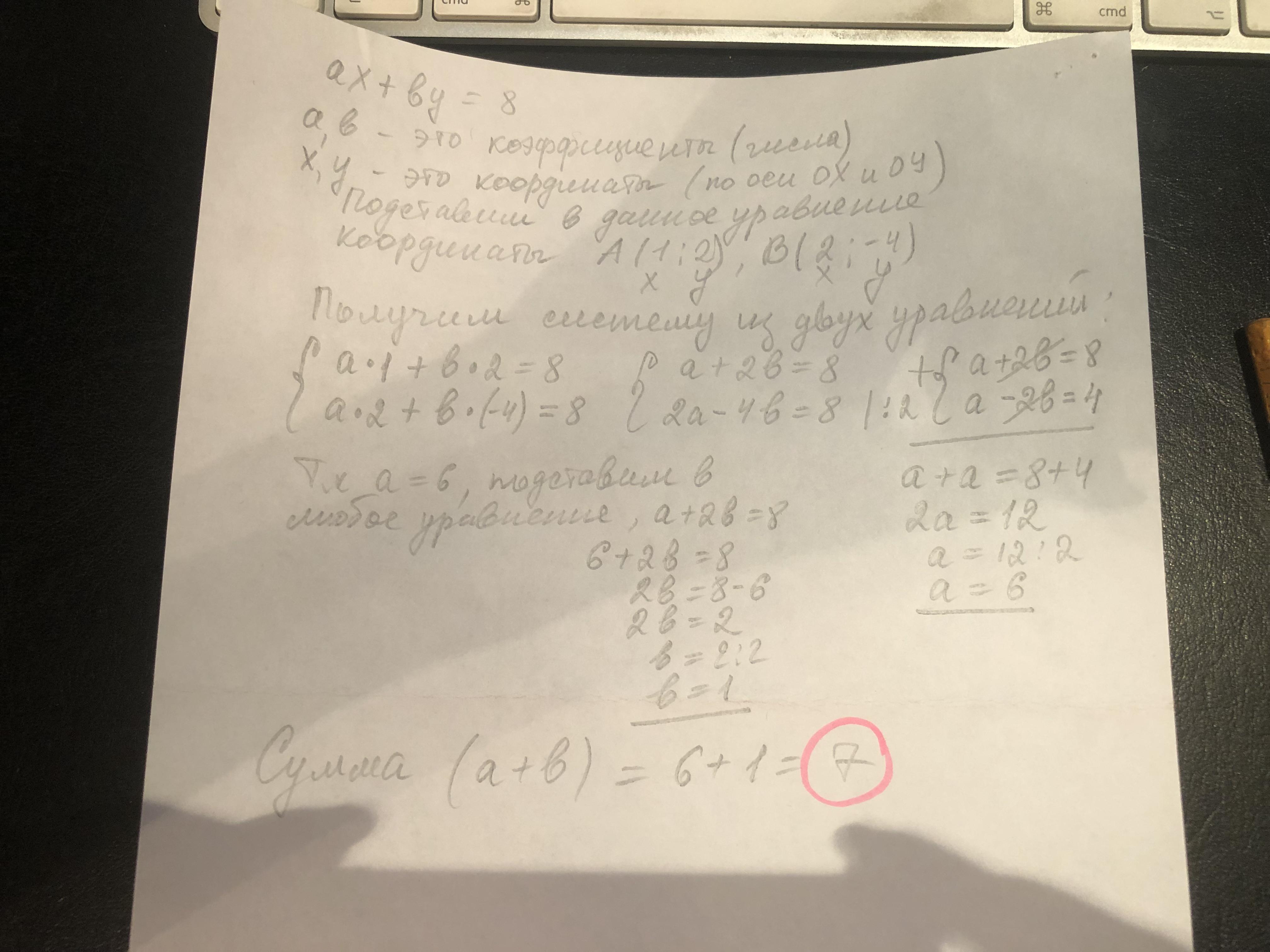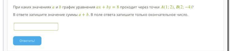 При каких значениях и график уравнения +=8 проходит через точки (1;2), (2;−4)?