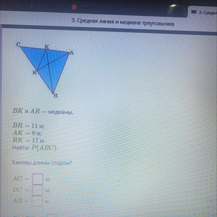 АВ=2*КR=2*17=34м средняя линия треугольника равна половине параллельной стороне.