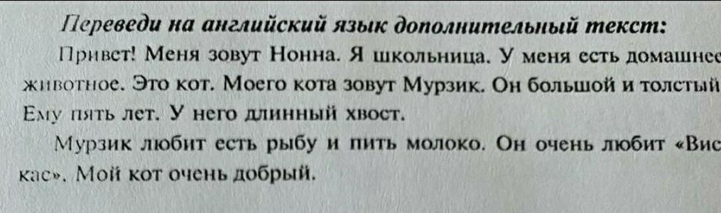 Hi! My name is Nonna. I Schoolgirl. I have a pet. Its cat. my cat's name is Murzik. He big and fat. He is five years old. He has a long tail.