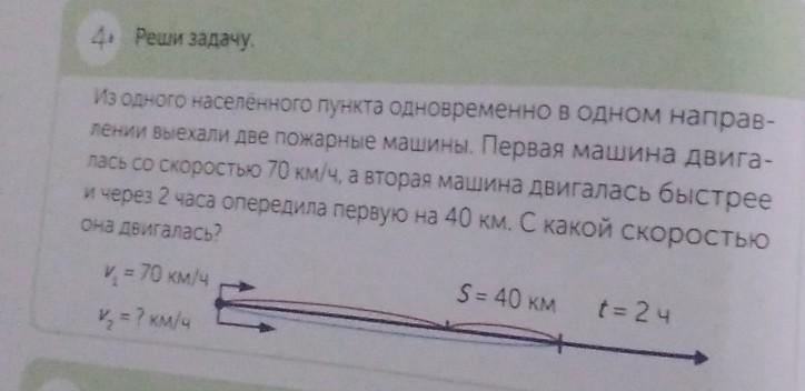 из одного населённого пункта одновременно в одном направлении выехали две пожарные машины. первая машина двигалась со скоростью 70 км/ч, а вторая машина двигалась быстрее и через 2 часа опередила первую на 40 км/ч.с какой скоростью она двигалась? только решение, уравнением не надо