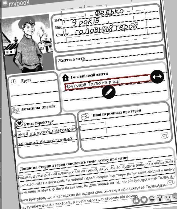 Відповідь:друзі він не мав справжніх друзів інші персонажі про героя був невгамовним, розбишакою, але в душі був людиною з великимвеликим, добрим серцем.