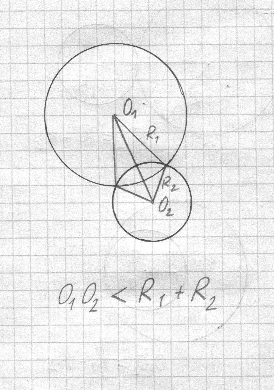 Нарисуйте Две окружности которые пересекаются в 2 точках. Измерьте длины их радиусов, расстояние между их центрами сделайте вывод.
