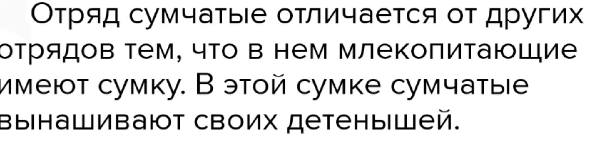 Особенности внутреннего строения. Вторая характерная особенность сумчатых — это особое строение нижней челюсти, нижние (задние) концы которой загнуты внутрь. Коракоидная кость у сумчатых слита с лопаткой, как у высших млекопитающих, — это отличает их от однопроходных. Строение зубной системы — важный классификационный признак отряда сумчатых. По этому признаку весь отряд делится на 2 подотряда: многорезцовых и двурезцовых.