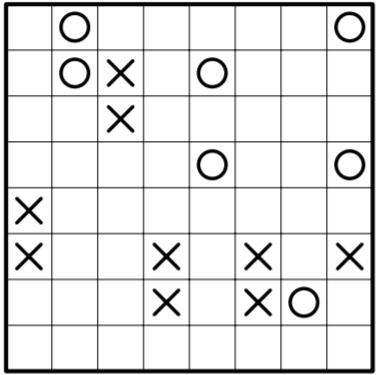 Заполните свободные клетки крестиками или ноликами так, чтобы в каждой строке и в каждом столбце было по четыре крестика и четыре нолика, в каждой строке и в каждом столбце может быть не более двух крестиков или ноликов подряд. Что будет в нижней строке в угловой клетке справа - крестик или нолик?
