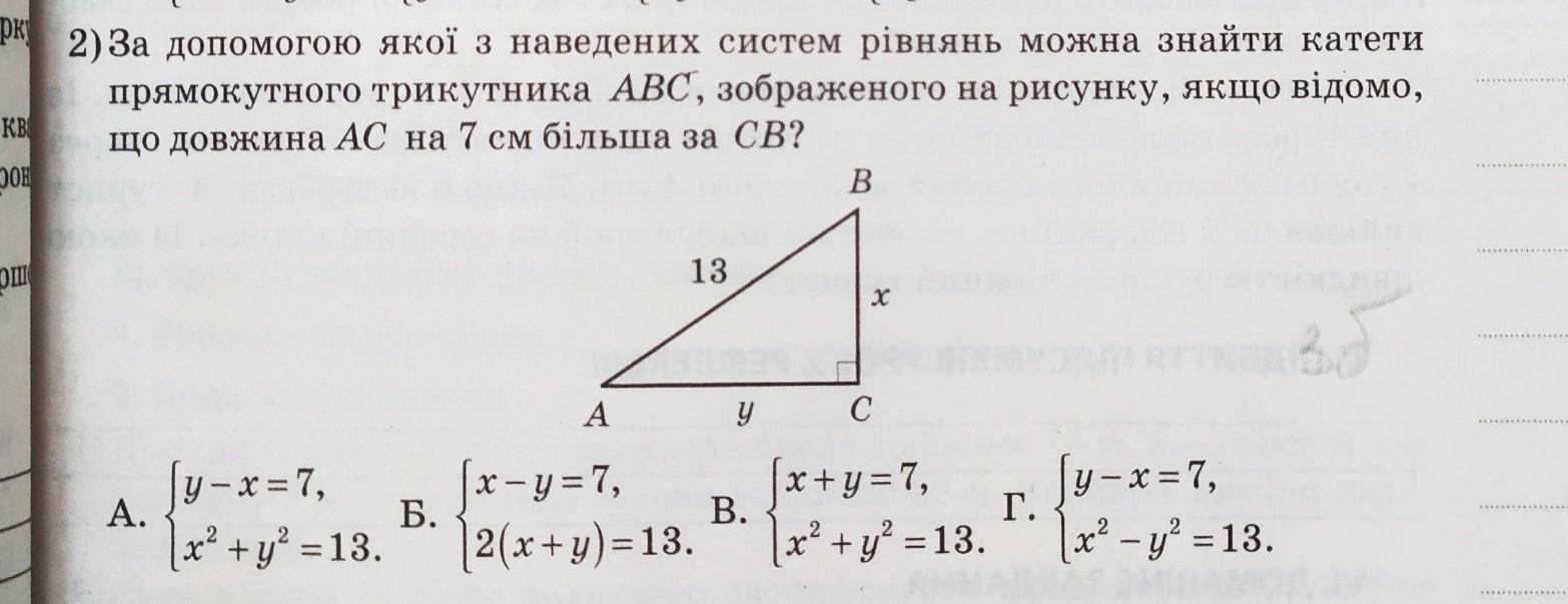 СРОЧНО За допомогою якої з наведених систем рiвнянь можна знайти катети прямокутного трикутника ABC, зображеного на рисунку, якщо відомо, що довжина АС на 7 см більша за СВ? (на фото)