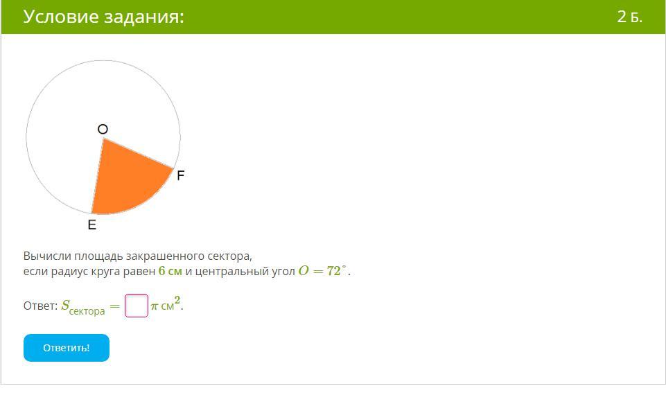 Sсек=π*6²*1/5=36π/5=7,2π см²