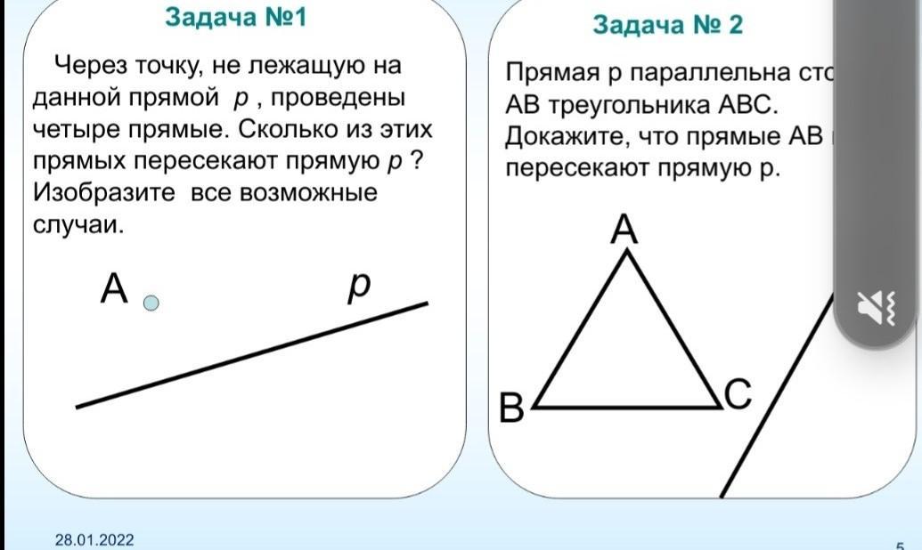 Через точку, не лежащую на прямой, может проходить ровно одна прямая параллельная данной (аксиома) => есть два случая. когда все прямые пересекают p и когда 3 пересекают и одна параллельна p