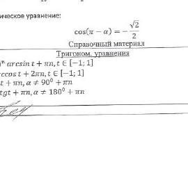 \displaystyle\bf\\Cos(\pi -\alpha )=-\frac{\sqrt{2} }{2} \\\\\\-Cos\alpha =-\frac{\sqrt{2} }{2} \\\\\\Cos\alpha =\frac{\sqrt{2} }{2} \\\\\\\alpha =\pm arc Cos\frac{\sqrt{2} }{2} +2\pi n ,n\in Z\\\\\\\alpha =\pm \frac{\pi }{4}+2\pi n,n\in Z