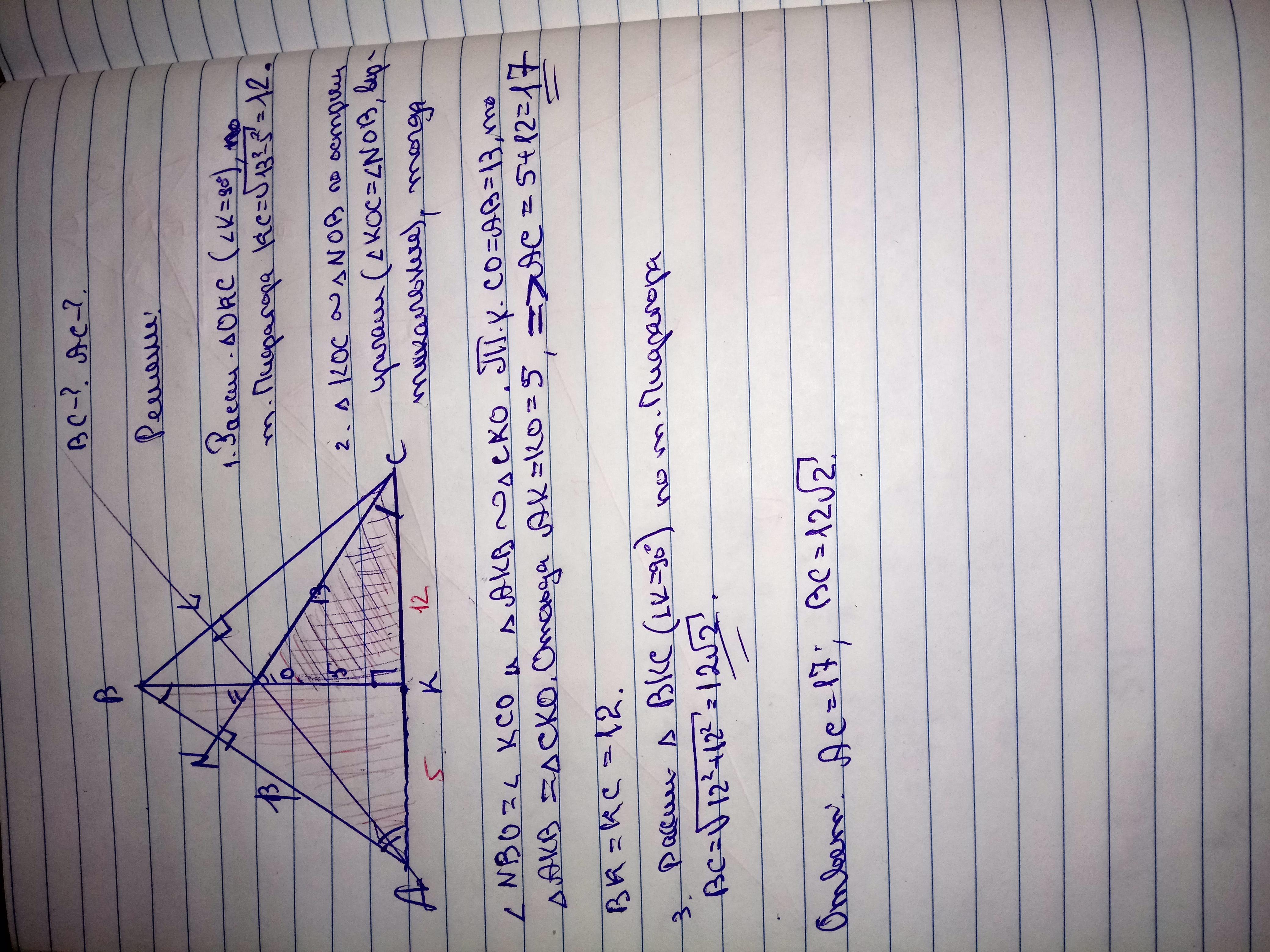Дан остроугольный треугольник ABC. Его высоты пересекаются в точке O. Если CO=AB=13, а точка О находится на расстоянии 5 см от стороны АС, то чему будут равны длины сторон BC и AC?