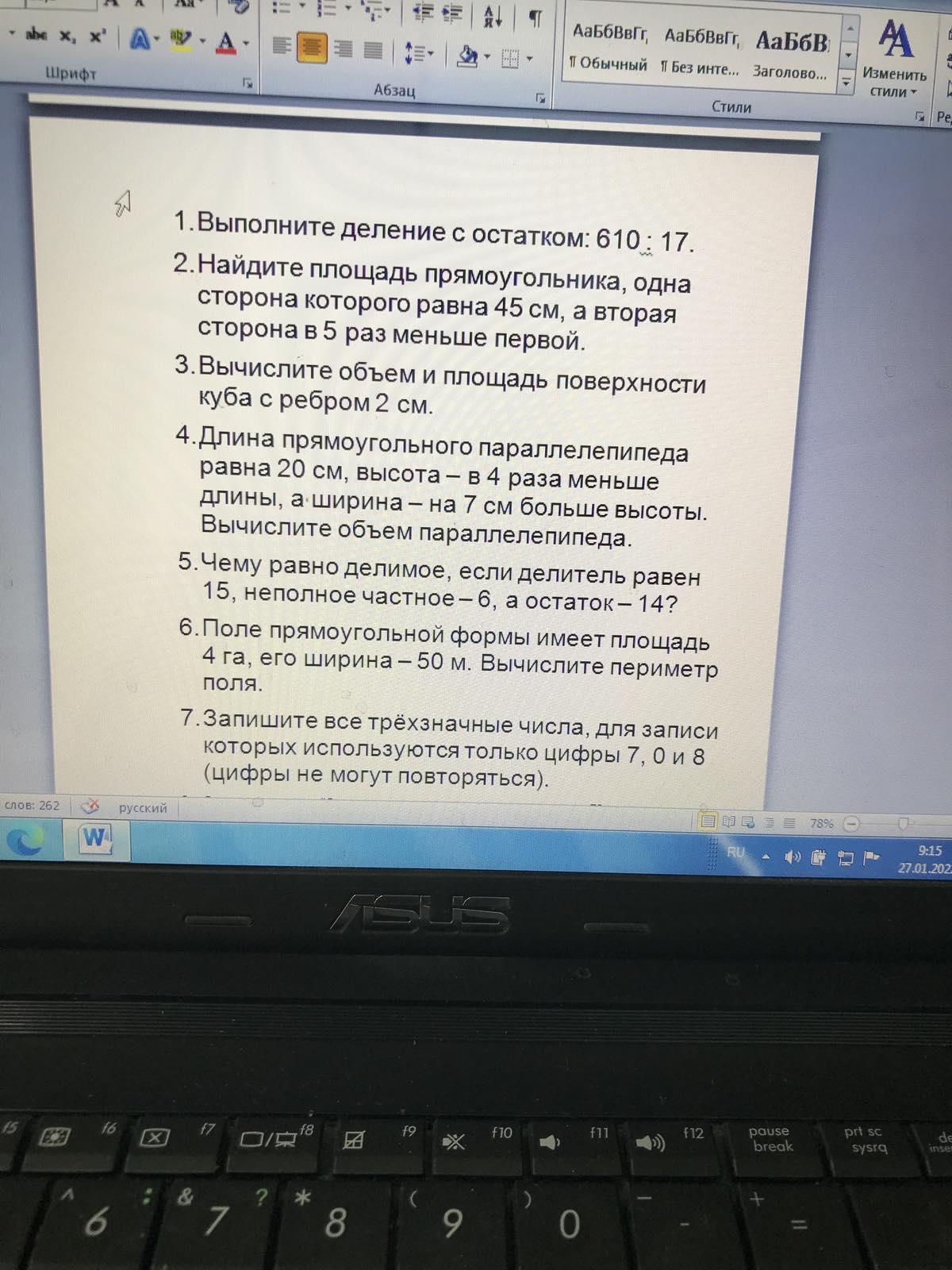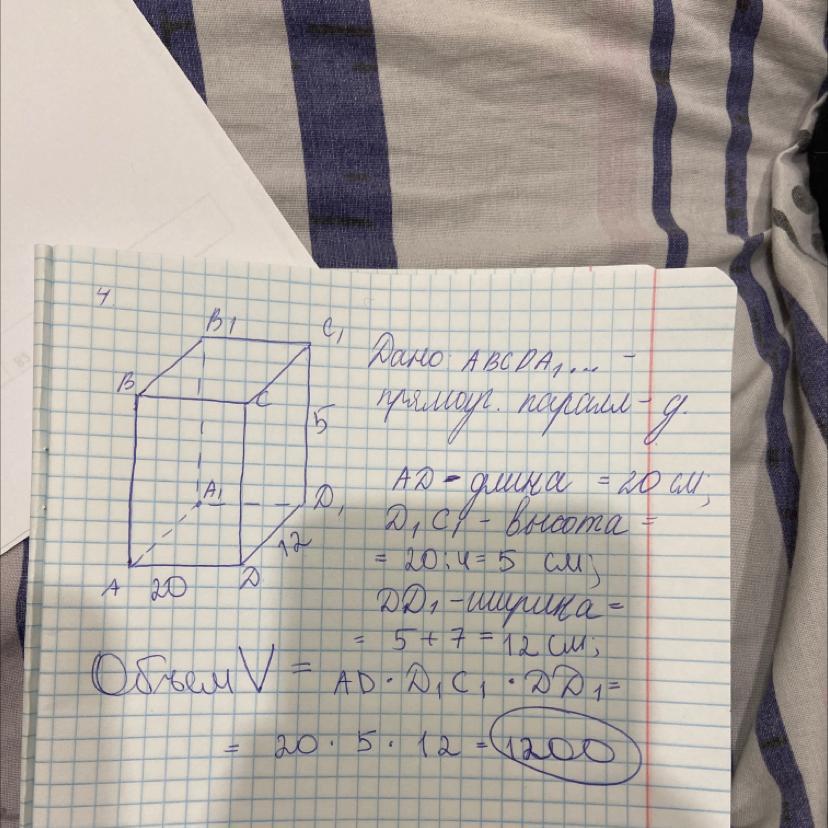 Длина уже известна - 20 см. Высота в 4 раза меньше, то есть 20/4=5. Высота равна 5 сантиметрам, а ширина 5+7=12 сантиметров. Нам известны: