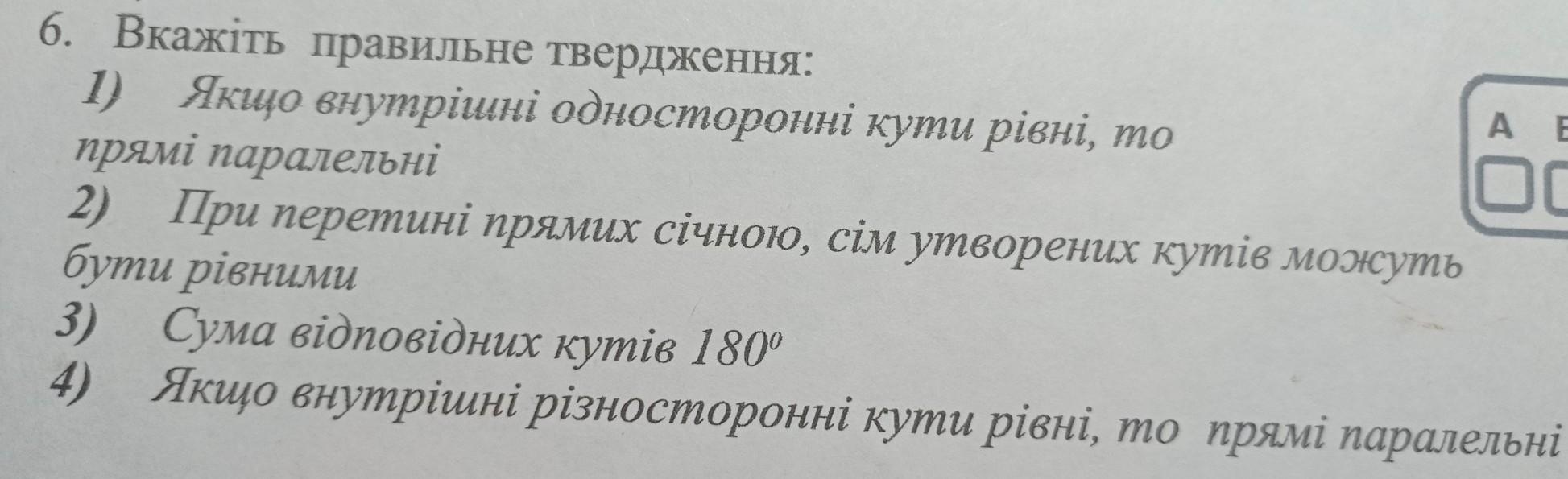 6. Вкажіть правильне твердження: 1) Якщо внутрішні односторонні кути рівні, то ОО прямі паралельні 2) При перетині прямих січною, сім утворених кутів можуть бути рівними 3) Сума відповідних кутів 180° 4) Якщо внутрішні різносторонні кути рівні, то прямі паралельні СРОЧНО