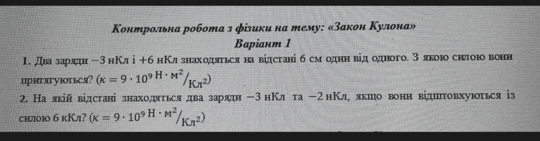 1. F = (9 * 10^9) * (3 * 10^(-9)) * (6 * 10^(-9)) / ((6 * 10^(-2))^2)