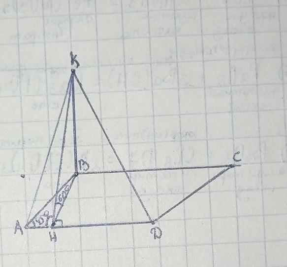 У ромбі ABCD AB = 8 см, кут BAD = 45°. З вершини B до площини ромба проведено перпендикуляр BK. Площина AKD утворює з площиною ромба кут 60°. Знайдіть:
