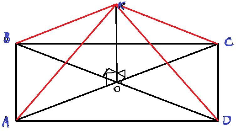 Із точки О- перетину діагоналей прямокутника , до його площини проведено перпендикуляр ОК. Доведіть ,що точка К рівновіддалена від вершин прямокутника.
