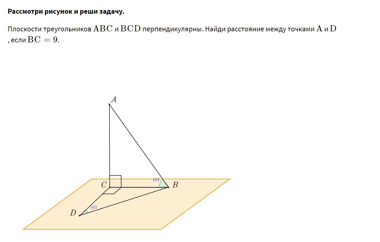 tg∠D = BC/CD ⇒ CD = BC/tg∠D = 9/√3 = 3√3