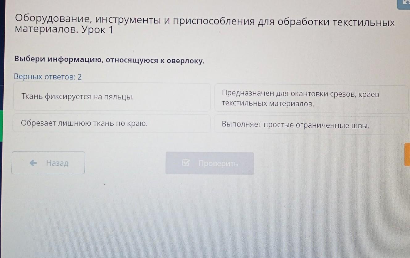 Выбери информацию, относящуюся к оверлоку. Верных ответов: 2 Ткань фиксируется на пяльцы. Предназначен для окантовки срезов, краев текстильных материалов. Обрезает лишнюю ткань по краю. Выполняет простые ограниченные швы. - Назад В Проверить с