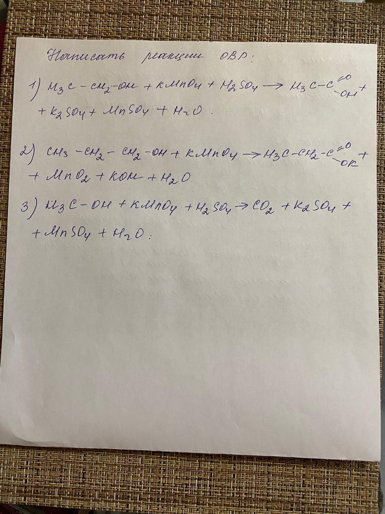 2) C⁻³H₃⁺¹-C⁻²H₂⁺¹-C⁻¹H₂⁺¹-O⁻²H⁺¹ + K⁺¹Mn⁺⁷O₄⁻² → C⁻³H₃⁺¹-C⁻²H₂⁺¹-C⁺³O⁻²O⁻²K⁺¹ + Mn⁺⁴O₂⁻² + K⁺¹O⁻²H⁺¹ + H₂⁺¹O⁻²