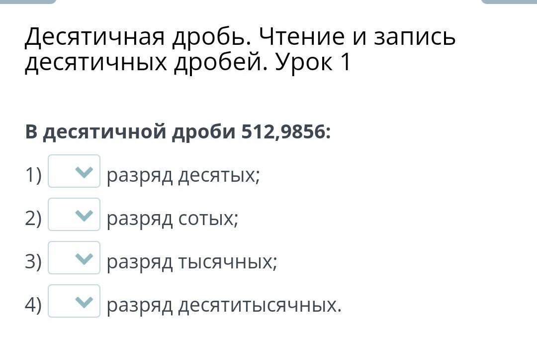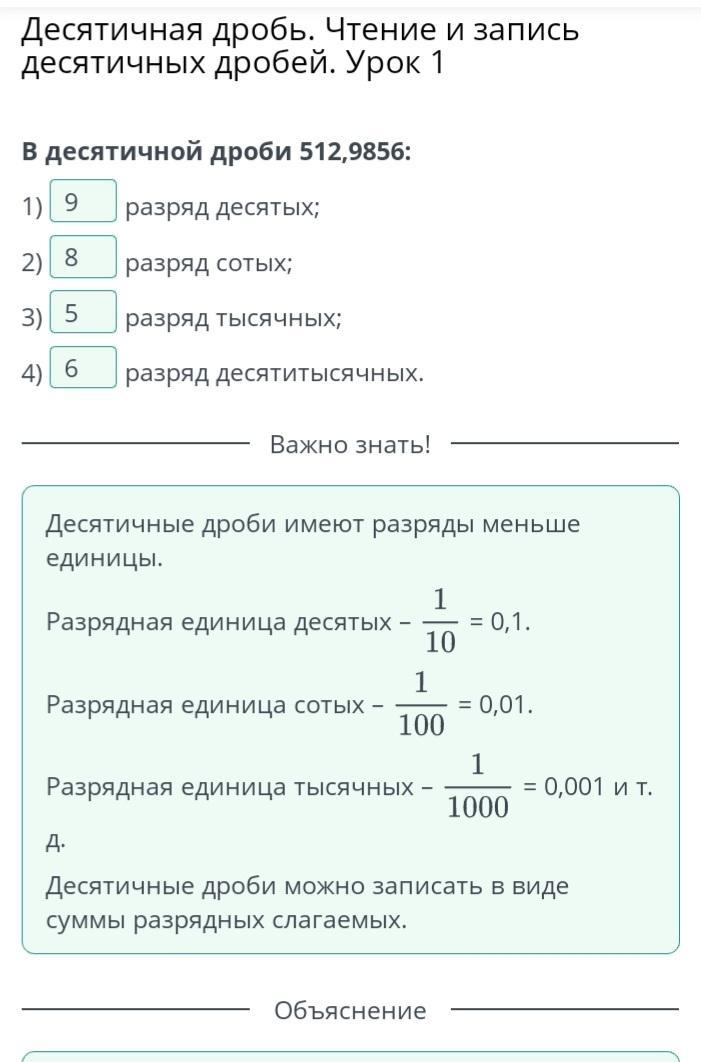 Десятичная дробь. Чтение и запись десятичных дробей. Урок 1 десятичной дроби 512,9856: 1) V разряд десятых; 2) разряд сотых; 3) > разряд тысячных; 4) разряд десятитысячных.