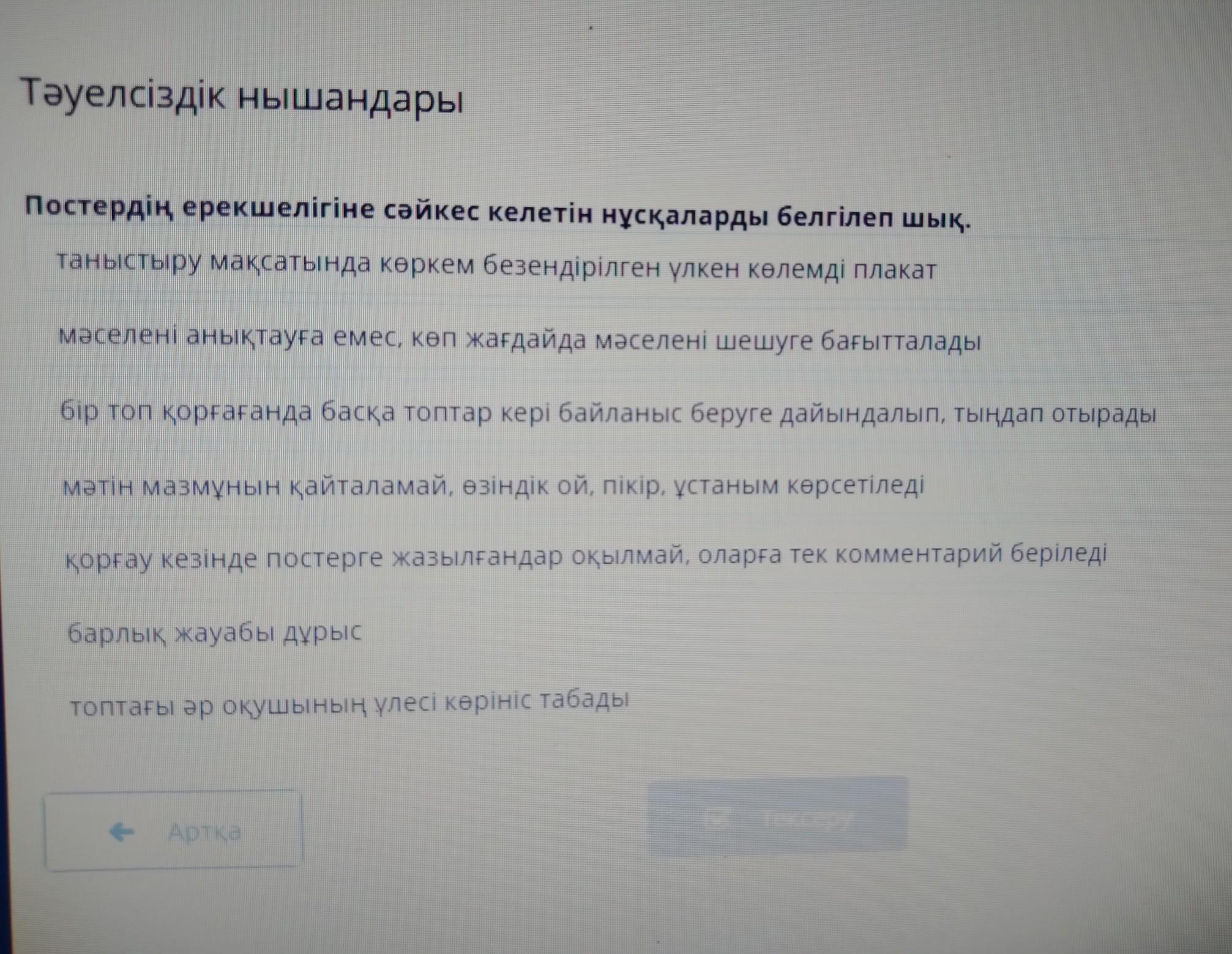 Постердің ерекшелігіне сәйкес келетін нұсқаларды белгілеп шық.