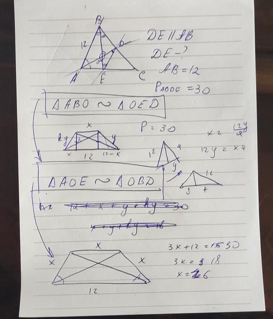 AD и BE - биссектрисы треугольника ABC, причём DE || AB. Найдите DE, если AB = 12, а периметр ABDE = 30.