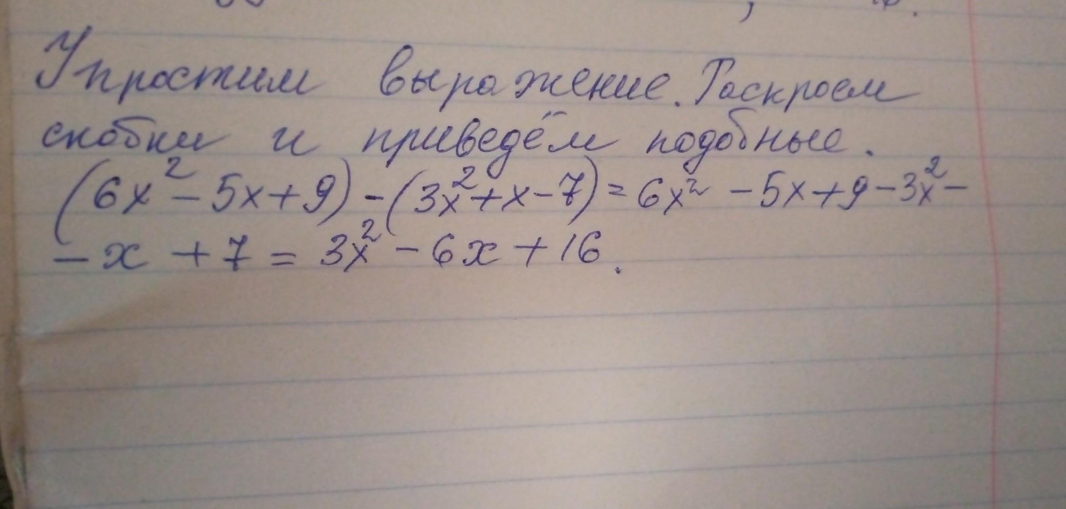представьте в виде многочлена стандартного вида. (6х²-5х+9)-(3х²+х-7)