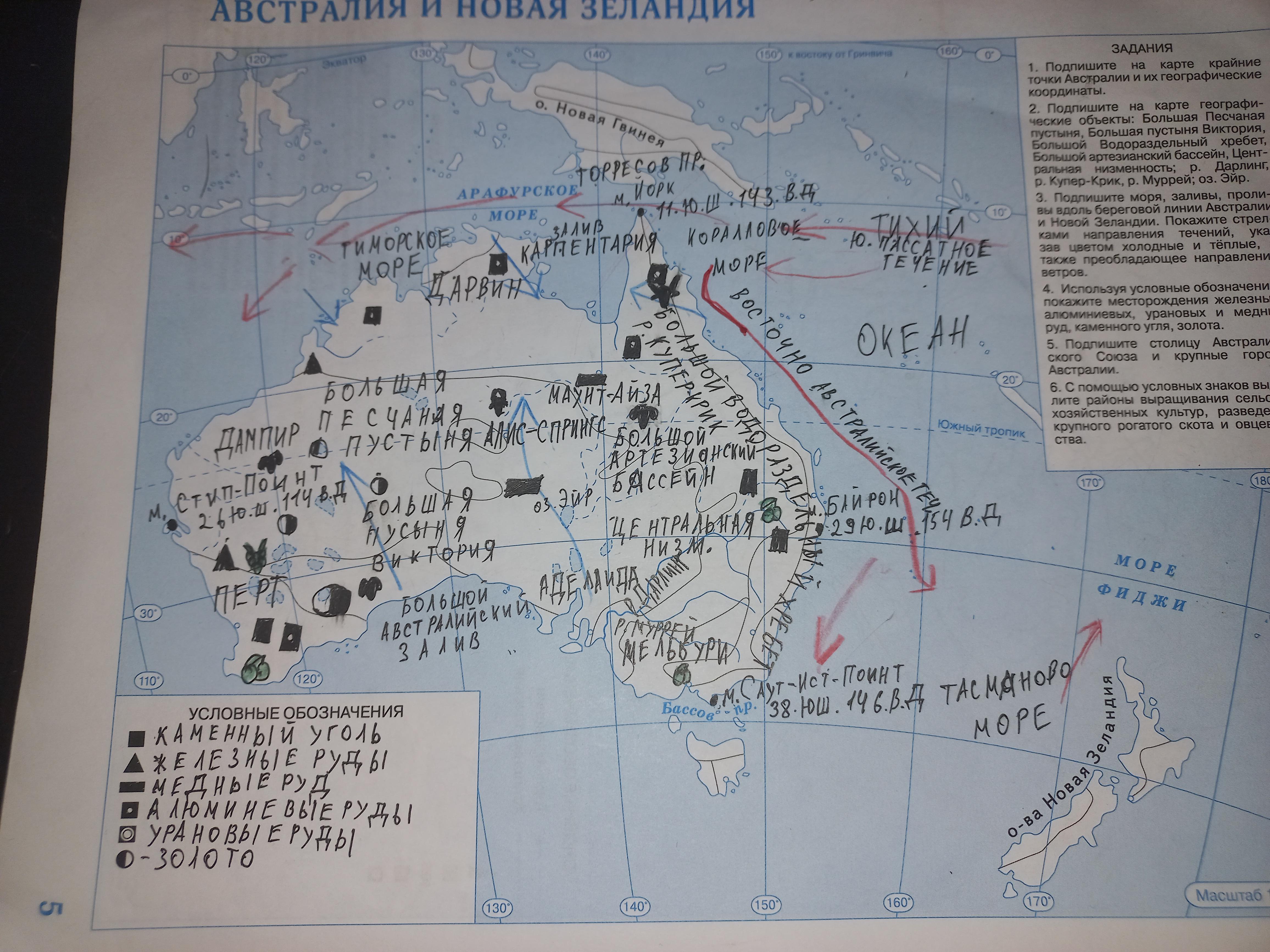 на ЗАДАНИЯ 1. Подпишите карте крайние точки Австралии и их географические координаты. 2. Подпишите на карте географи- ческие объекты: Большая Песчаная пустыня, Большая пустыня Виктория, Большой Водораздельный хребет, Большой артезианский бассейн, Цент- ральная низменность; р. Дарлинг, р. Купер-Крик, р. Муррей; оз. Эйр. 3. Подпишите моря, заливы, проли- вы вдоль береговой линии Австралии и Новой Зеландии. Покажите стрел- ками направления течений, течений, ука- зав цветом холодные и тёплые, а также преобладающее направление ветров. 4. Используя условные обозначения,