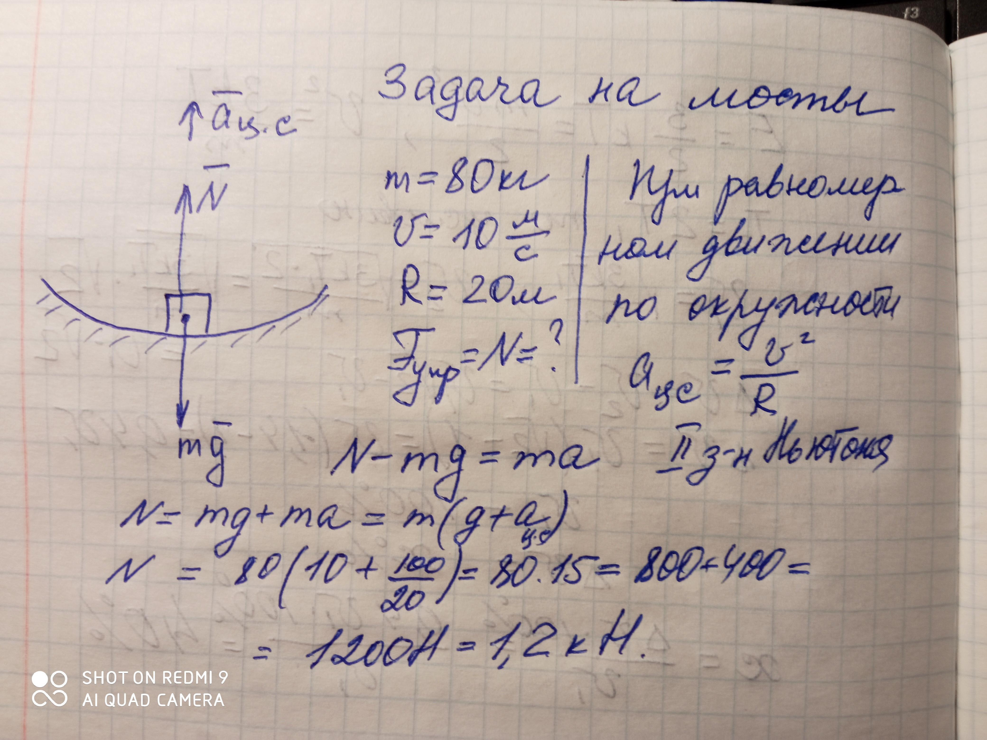 Велосипедист массой 80 кг движется со скоростью 10м/с по вогнутому мосту, траектория его движения является дугой окружности радиусом 20 метров. Определите силу упругости, действующую на велосипедиста в нижней части моста.