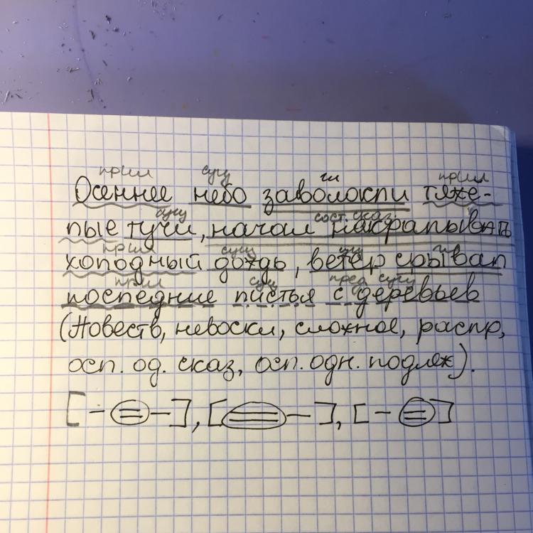 сделать синтаксический разбор предложения. Осеннее небо заволокли тяжёлые тучи, начал накрапывать холодный дождь, ветер срывал последние листья с деревьев