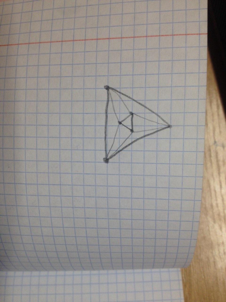 отметьте на плоскости 6 точек и соедините их прямые линии пересекающимися линиями так чтобы из каждой выходило 4 отрезка