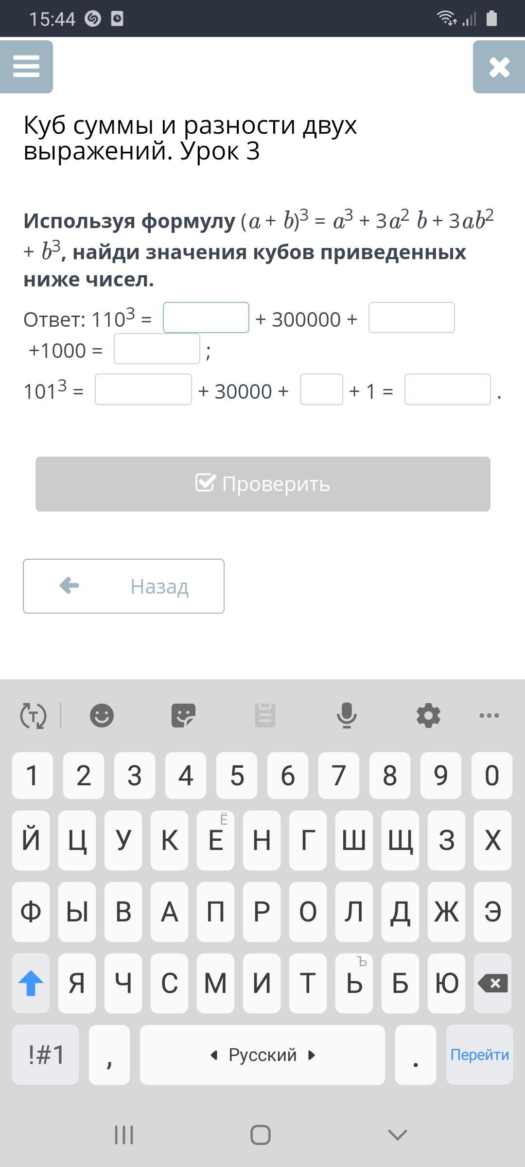 Куб суммы и разности двух выражений. Урок 3 Используя формулу (a + b)3 = a3 + 3a2 b + 3ab2 + b3, найди значения кубов приведенных ниже чисел. Ответ: 1103 = 11000000 + 300000 + +1000 = ; 1013 = + 30000 + + 1 = .