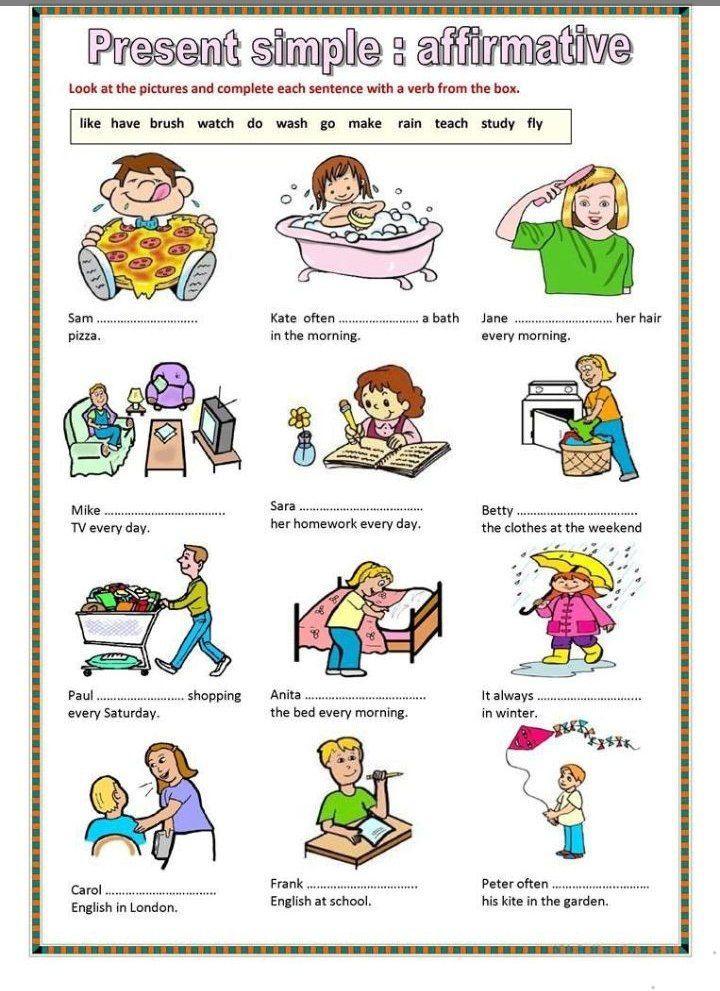 Look at the pictures and complete each sentence with the verb from the box. (The verbs are in complete order only following the rules for the third person.