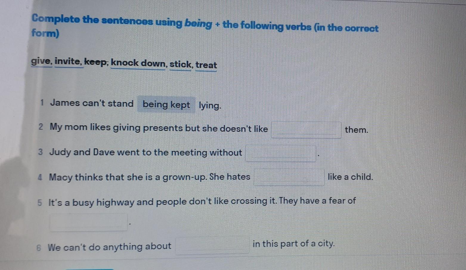 Это задание в СкайСмарте по Английскому Языку. Требуется подставить слова с being в предложения
