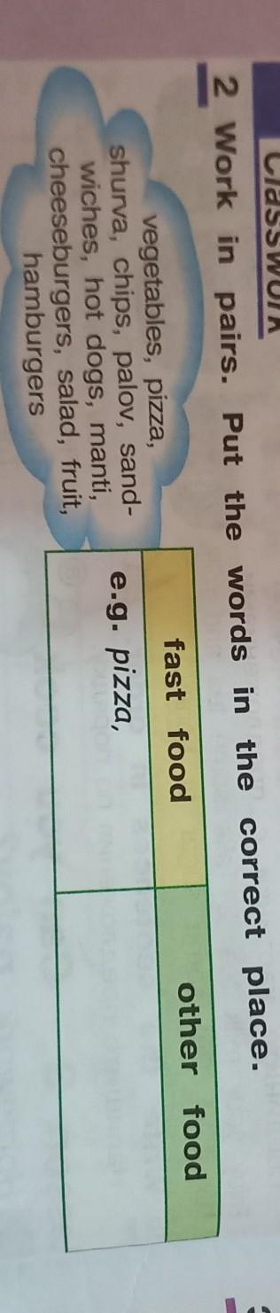 2 Work in pairs. Put the words in the correct place. fast food other food. vegetables, pizza, shurva, chips, palov, sand- wiches, hot dogs, manti, cheeseburgers, salad, fruit, hamburgers e.g. pizza, НУЖНО СЛОВА ПО ПАРЯДКУ ПАСТАВИТ ФАСТ ФУД И ПРОСТАЯ ЕДА ПАЖАЛЮСТА ПАМАГИТЕ.