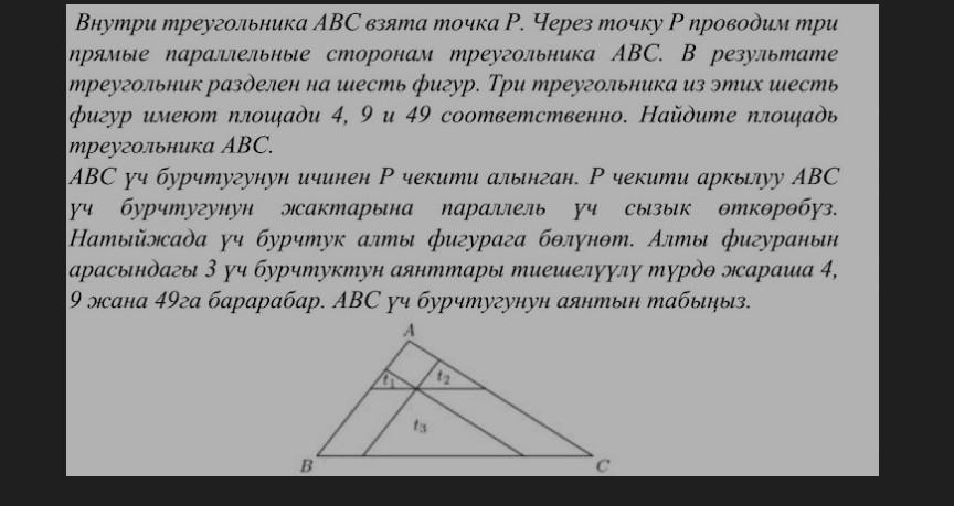 Внутри треугольника АВС свята точка Р. Через точку Р проводим три прямые параллельные сторонам треугольника ABC. В результате треугольник разделен на шесть фигур. Три треугольника из этих шесть фигур имеют площади 4. 9 и 49 соответственно. Найдите площадь треугольника ABC