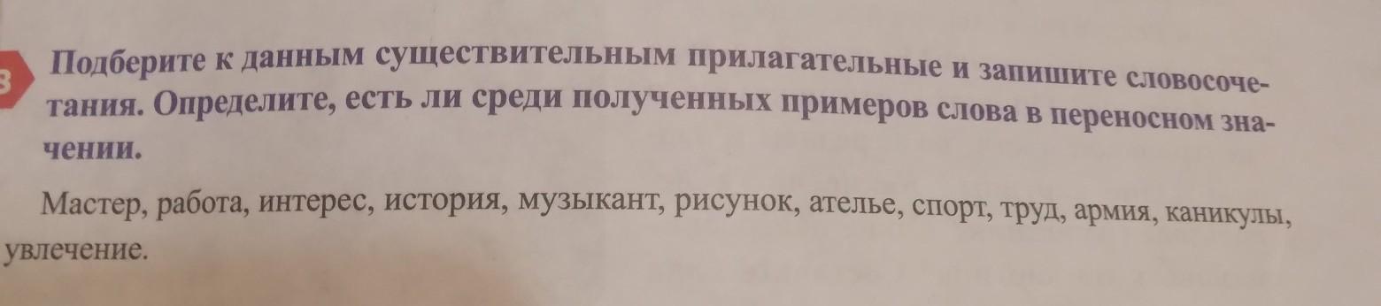 Подберите к данным существительным прилагательные и запишите словосоче- тания. Определите, есть ли среди полученных примеров слова в переносном зна- чении. Мастер, работа, интерес, история, музыкант, рисунок, ателье, спорт, труд, армия, каникулы, Влечение.