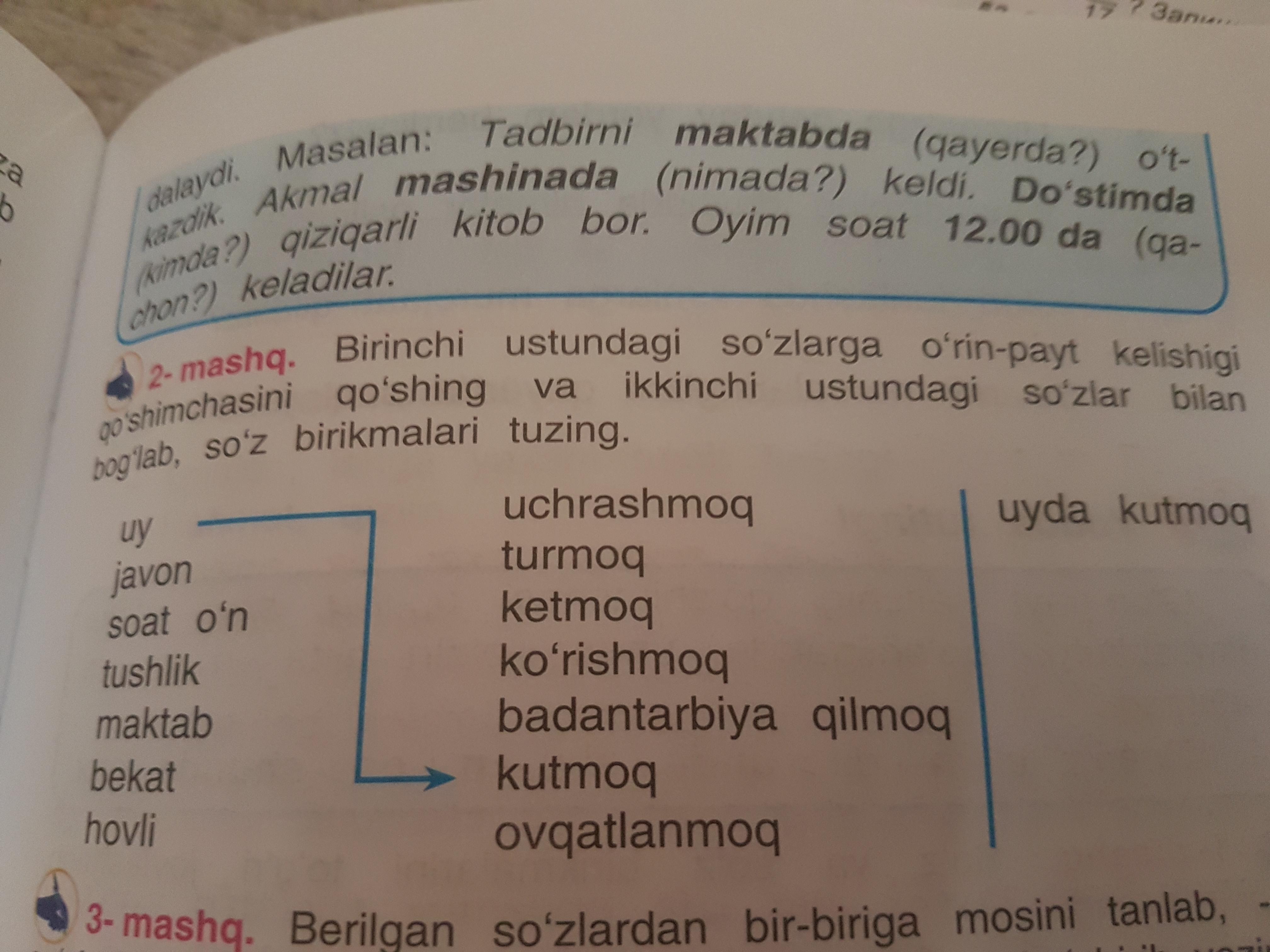 Uyda kutmoq,tushlikda ovqatlanmoq,soat o'nda ketmoq,maktabda ko'rishmoq,hovlida badantarbiya qilmoq,bekatda uchrashmoq,javonda turmoq
