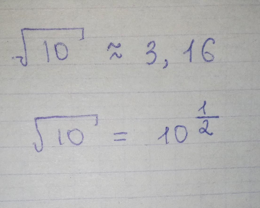 10^1/2 или ≈3,16 Если быть точным, корень из 10 = 3.16227766017