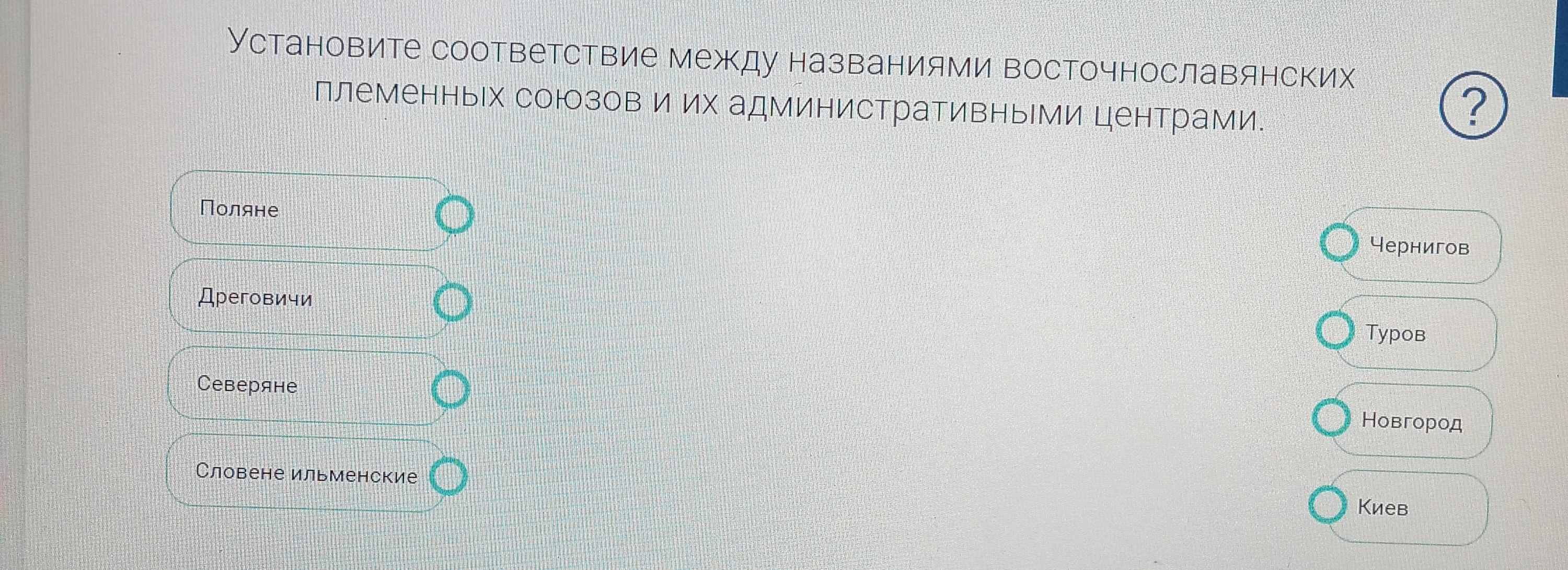 Установите соответствие межлу названиями восточнославянских племенных союзов и их административными центрами.