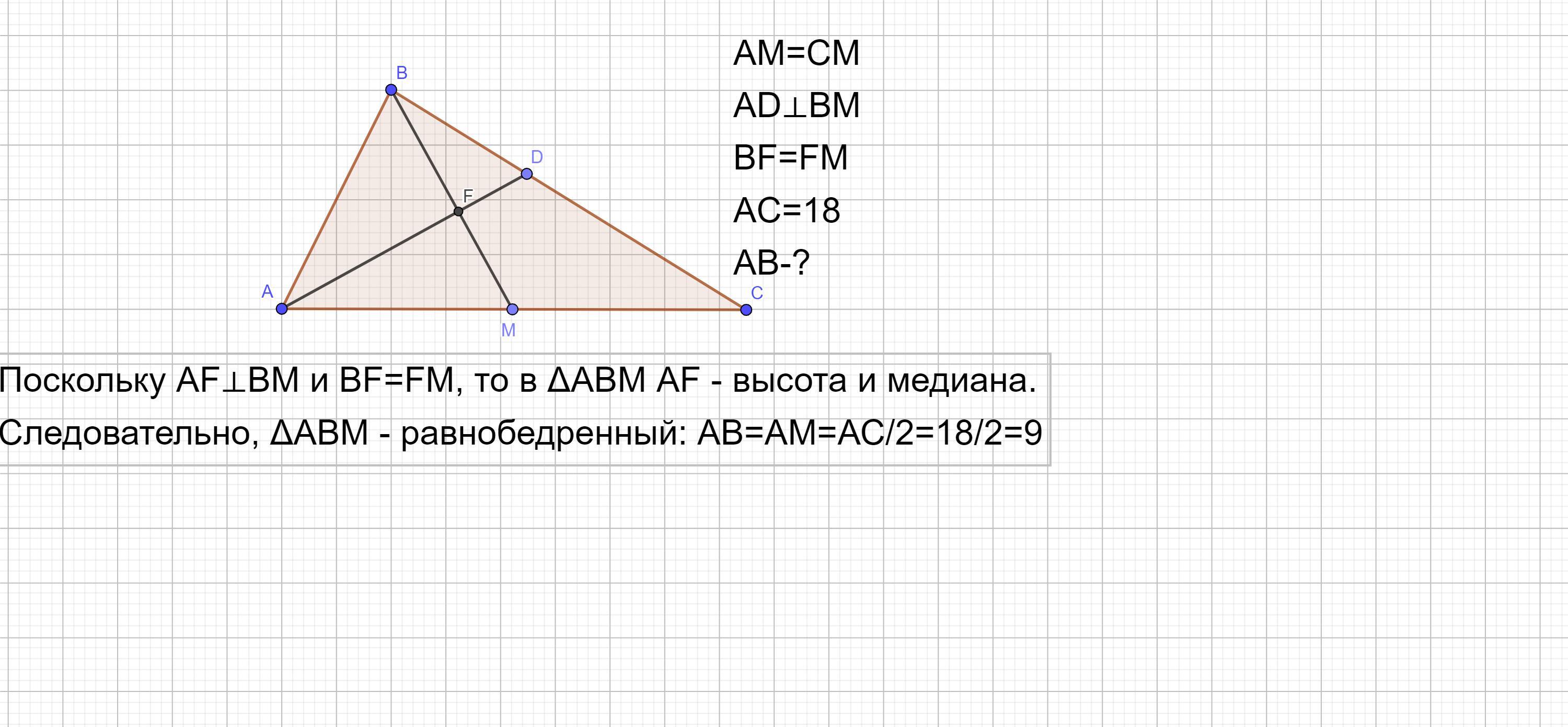 Прямая AD, перпендикулярная медиане ВМ треугольника АВС, делит её пополам. Найдите сторону АВ, если сторона АС равна 18.