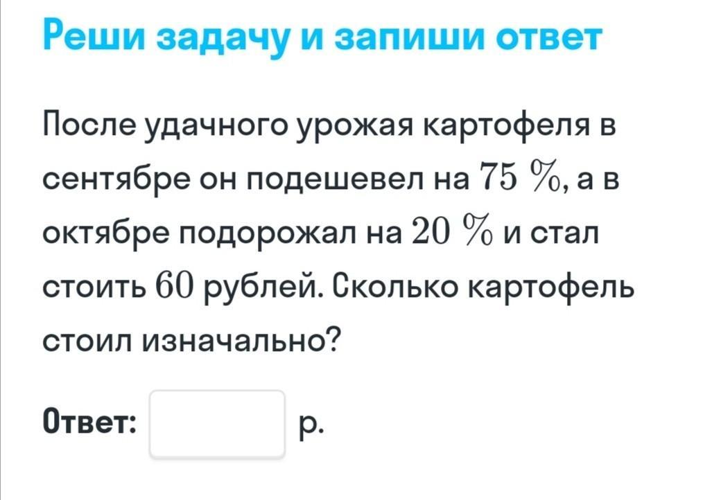 После удачного урожая картофеля в сентябре, он подешевел на 75%,а в октябре подорожал на 20% и стал стоить 60 руб.