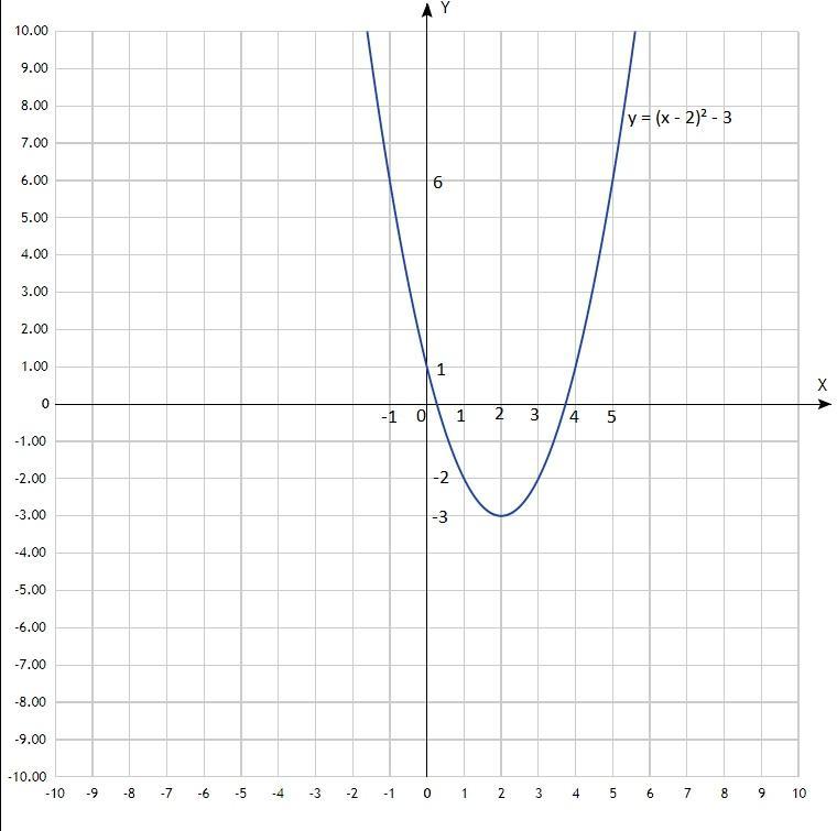 График - парабола, ветви направлены вверх, центр смещён по оси Ох вправо на 2 единицы и по оси Оу вниз на 3 единицы. Придать значения х, подставить в уравнение, вычислить у, записать в таблицу.