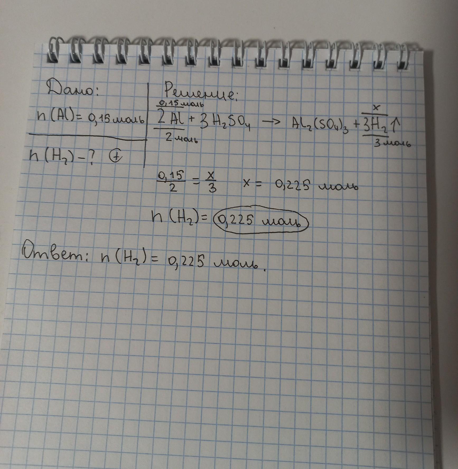 Определите количество вещества водорода, который выделится при взаимодействии 0.15 моль алюминия с серной кислотой, если кроме водорода образуется сульфат алюминия