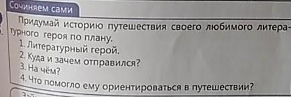 Придумай историю путешествия своего любимого литера- турного героя по плану. 1. Литературный герой. 2. Куда и зачем отправился? 3. На чём? 4. Что помогло ему ориентироваться в путешествии? 3 класс плисс